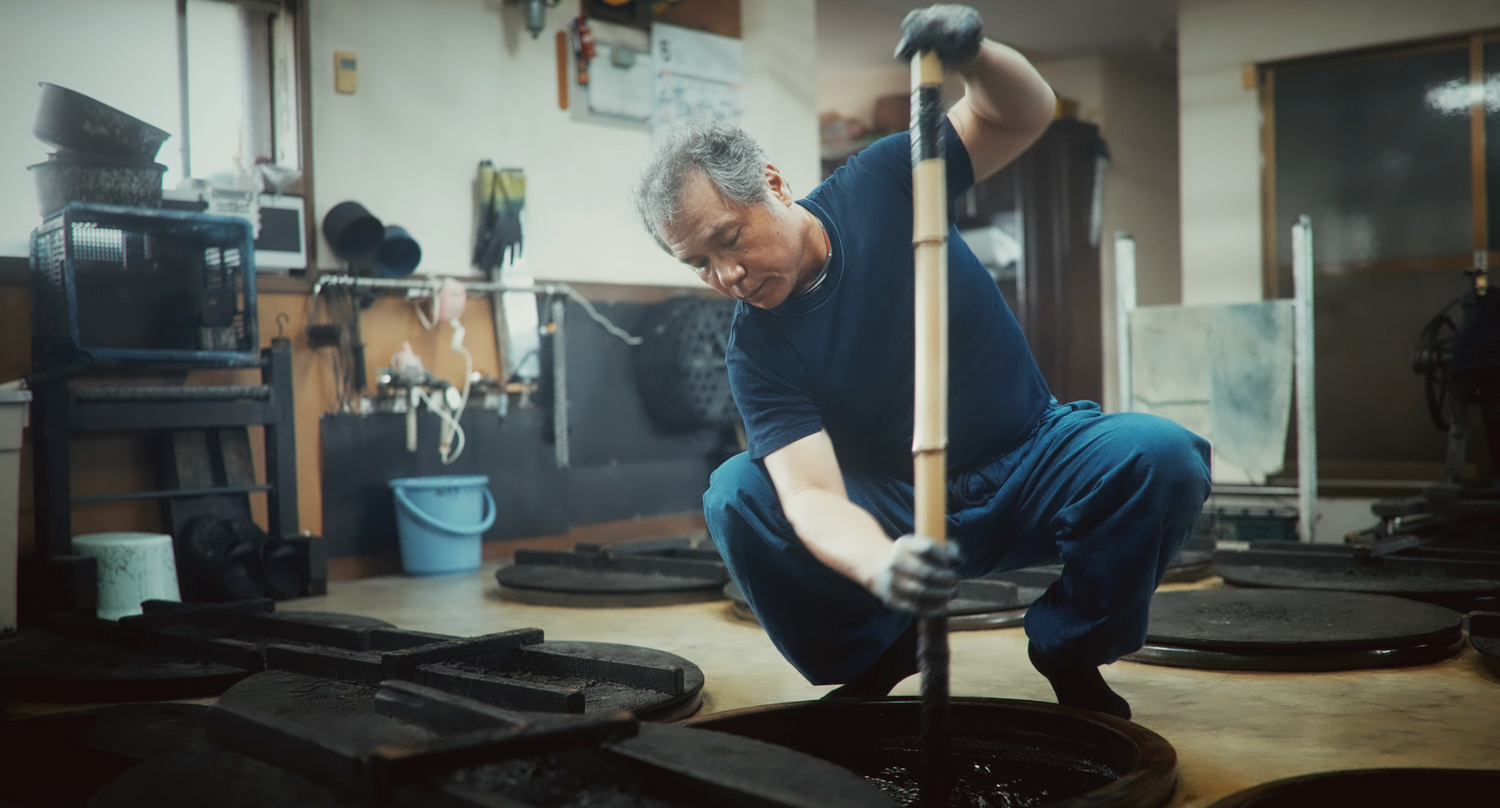 発酵してできた、「天然灰汁発酵建」の藍液は生きているために、常時つきそって手入れが必要で、矢野藍秀は、毎日この藍32本と共に生活してます。